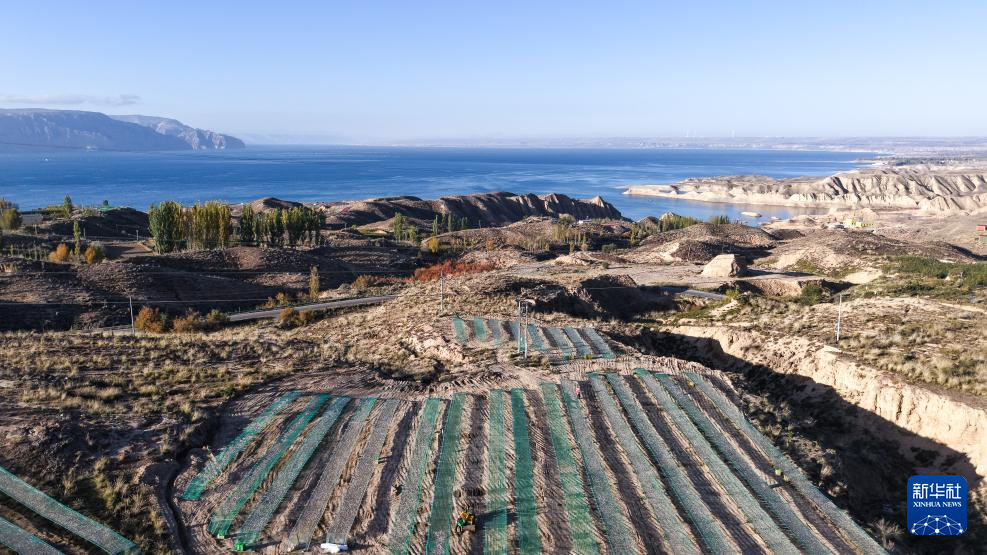 10月18日拍摄于青海省海南藏族自治州共和县龙羊新村龙羊峡海湖渔业捕捞合作社的小银鱼晾晒网(无人机照片)。新华社记者 齐芷玥 摄