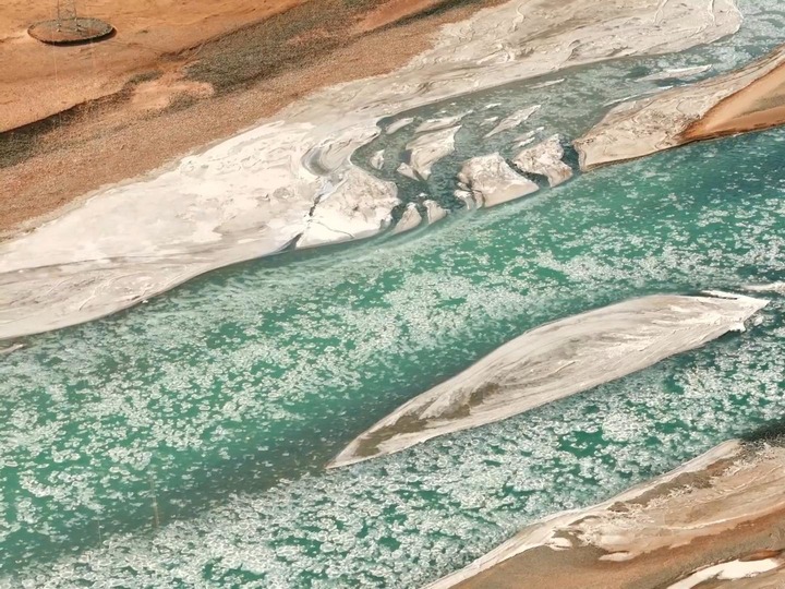 青海省玉树藏族自治州曲麻莱县平均海拔超过4500米,随着气温变化,河道出现大片浮冰,随河水缓缓流动。阳光洒下,浮冰泛着光泽,宛若一条流动的玉带。河面浮冰顺流而下,碰撞间泛起阵阵涟漪,充满了自然的纯粹与壮阔,解锁出高原冬日限定浪漫。