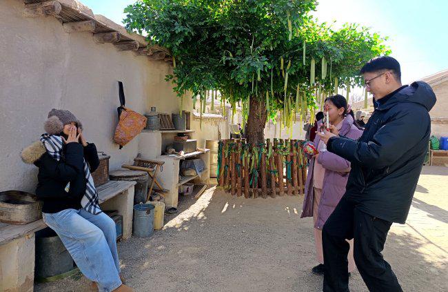 游客在柯鲁柯镇沉浸式影视文旅基地内参观体验。新华网发(蔡得军 摄)